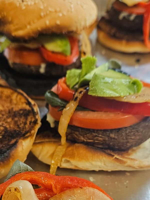 With the help of my fabulous staff especially Tyler, we have come up with a masterpiece. We grill the portobello, fill it with Swiss cheese, and a tomato on top of that. Towards the end we add grilled red pepper and onion, a leaf or 2 of basil fresh out of our garden and some slices of avocado.