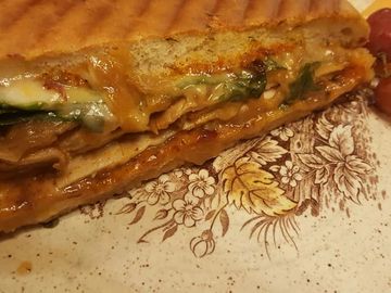 Six standard ones: Ham & Brie; Ham, Bacon & Swiss; Mushroom and Smoked Provolone;  Jalapeño and Cheddar, Spinach and goat cheese with pesto, onion and olives.  Bacon cheeseburger for a bit more.