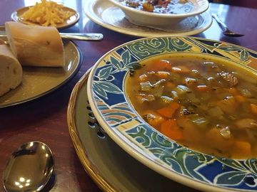 Homemade soup. Usually gluten free and often vegan. Some of the most popular have been Split Pea, (Vegan) Corn Chowder, Mushroom and Turkey. There was a lovely Red Pepper Bisque recently and a vegetarian Chili. Served in either a cup or bowl, with a housemade bread.